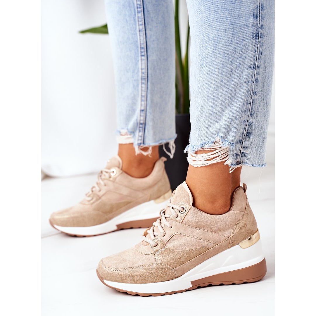 Os tênis de cunha bege Temida da marca PE1 são uma combinação perfeita de design moderno e conforto que atenderão às necessidades de toda mulher que aprecia calçados esportivos elegantes. Feitos de camurça ecológica e couro ecológico de alta qualidade com um sutil padrão animal, esses sapatos irão adicionar personalidade a qualquer estilo.
