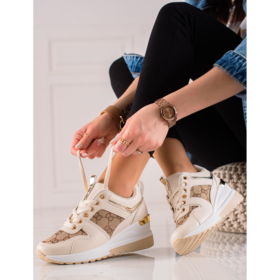 Detalhes: TRENDI Tênis da moda em cunha bege marrom