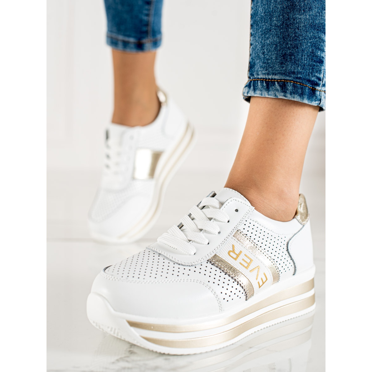 Graças ao seu estilo moderno e desportivo, os ténis SHELOVET combinam perfeitamente com as últimas tendências. A sua delicada cor branca e o seu padrão vazado conferem-lhes um carácter único que certamente irá agradar a todos os fashionistas. O interior do calçado confeccionado com uma combinação de couro natural e imitação de couro proporciona ventilação adequada e a palmilha em couro aumenta o conforto de uso.