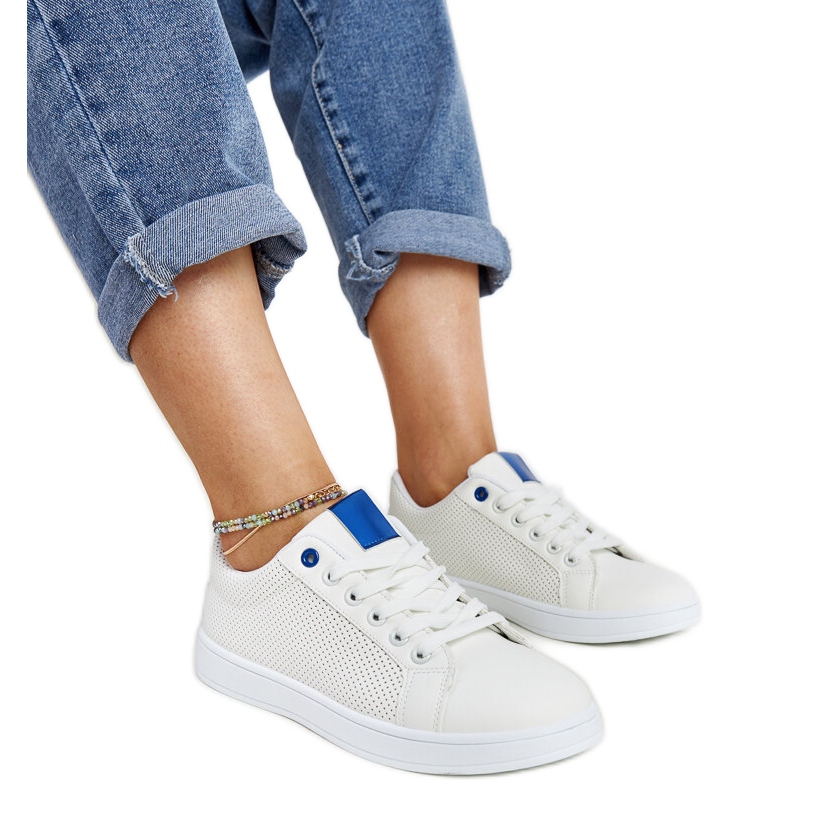 O modelo semi -colorido branco com detalhes em azul faz parte das últimas tendências, oferecendo uma aparência fresca e leve que animará qualquer roupa de mola. Feito de couro ecológico e material têxtil, eles combinam estética e cuidam do meio ambiente. O corte baixo do sapato os torna adequados para jeans e vestidos arejados, adicionando todas as estilização dos pecados da moda.
