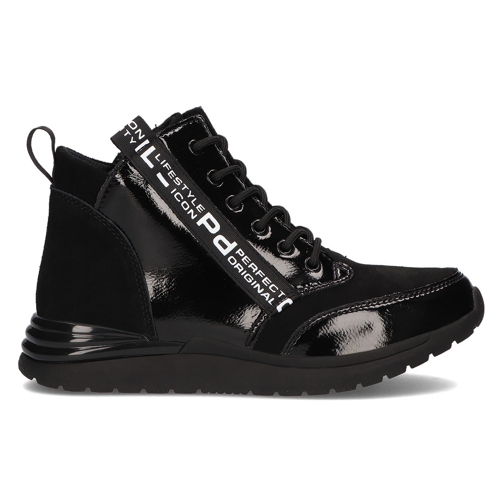 Esses tênis são caracterizados por biqueira redonda e cano alto de 9 cm, que proporciona suporte adicional para o tornozelo. A sola, de plástico, não é apenas estética, mas também durável e resistente à abrasão. A altura da plataforma de 1,5 cm e o salto baixo tornam-nos extremamente confortáveis, permitindo uma utilização prolongada sem sensação de cansaço nas pernas.