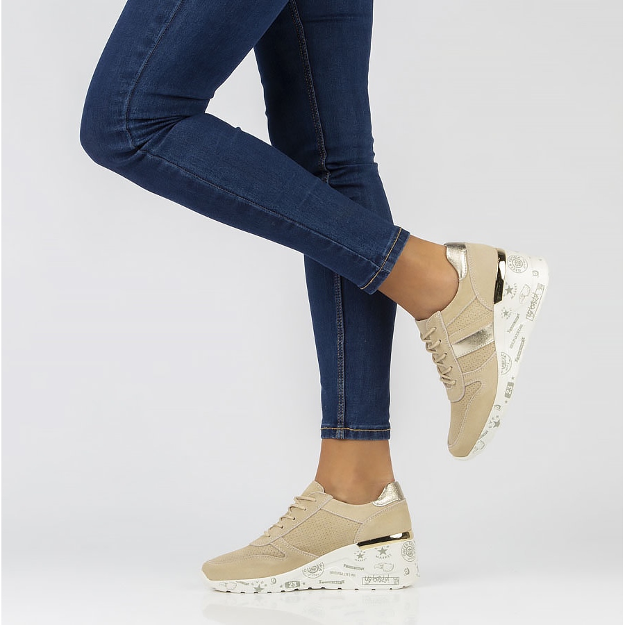 A sua cor bege universal faz com que combinem perfeitamente com uma variedade de estilos, do casual ao mais elegante. Uma plataforma de 2 cm de altura e uma cunha de 5,5 cm de altura não só alongam visualmente a silhueta, mas também proporcionam conforto adicional ao caminhar.