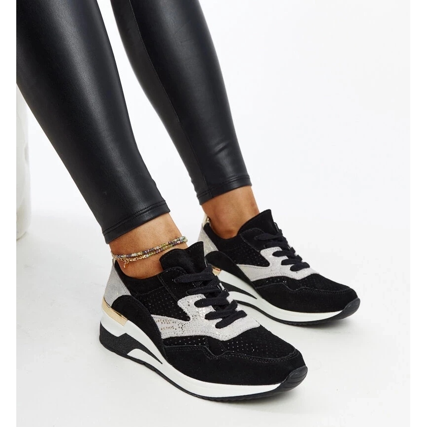 A altura da cunha de 11,5 cm permite uma confortável elevar a figura, sem desistir do conforto dos sapatos esportivos. Os tênis de Manfrin estão disponíveis em uma elegante cor preta que combina perfeitamente com várias estilizações.