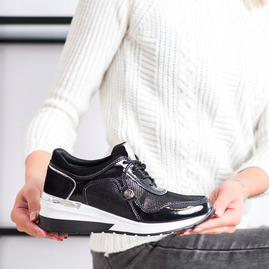 Os tênis VINCEZA pretos caracterizam-se pela altura baixa, o que os torna perfeitos para qualquer estação do ano, independente da estação. Graças à plataforma de 5 cm de altura, você pode desfrutar de uma elevação sutil que confere leveza à silhueta. A ponta redonda e o salto macio embutido aumentam o conforto de uso, e o fecho com cadarço permite um ajuste perfeito ao pé.