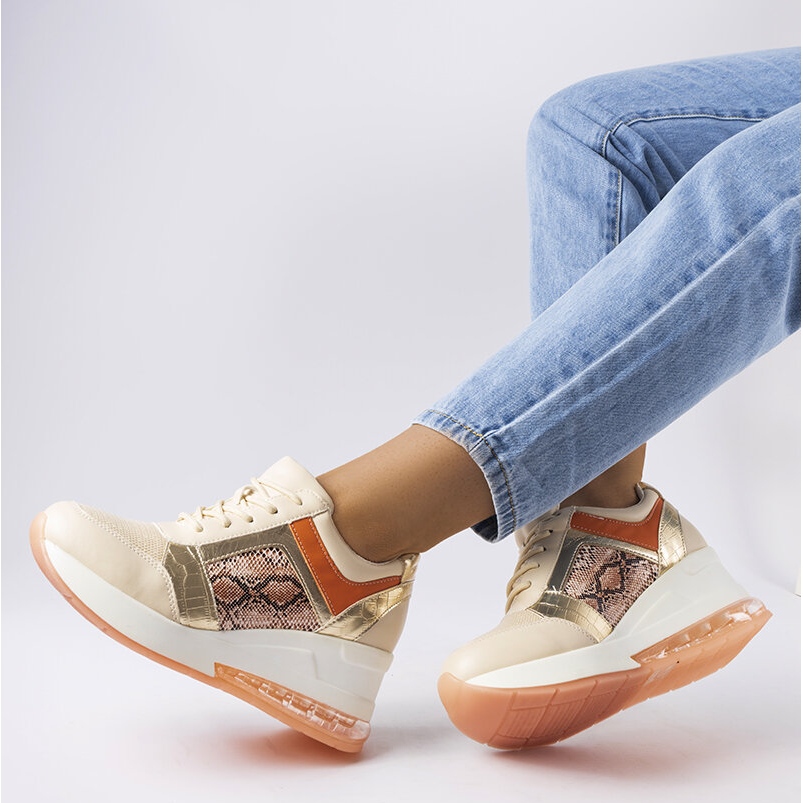 Confeccionados em couro ecológico de alta qualidade, os tênis oferecem não só aparência estética, mas também durabilidade. Uma vantagem adicional é o prático salto em cunha, que proporciona estabilidade e suporte aos pés. A cor bege com detalhes dourados faz com que estes sapatos combinem perfeitamente com vários estilos, tanto casuais como mais elegantes.
