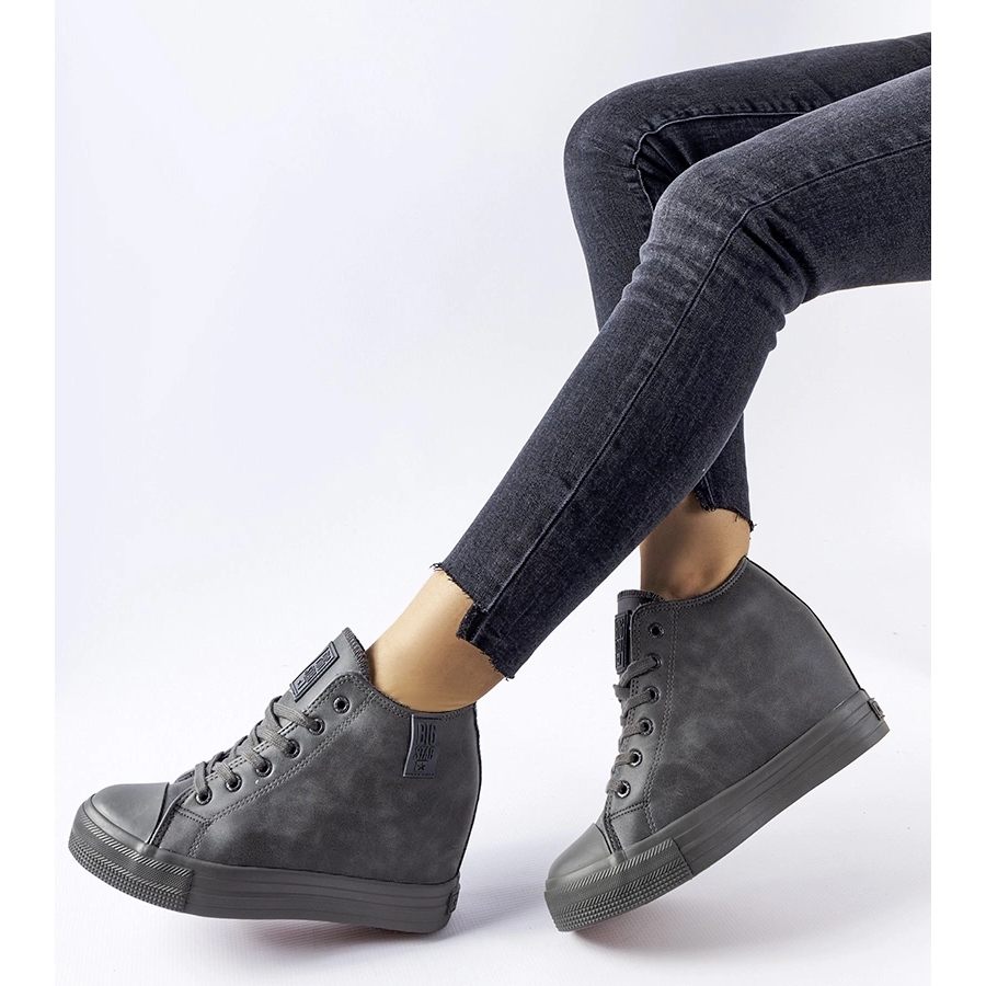 Elegante e ao mesmo tempo confortável - tênis de alto bacon Big Star MM274005 é uma proposta ideal para mulheres que valorizam uma aparência elegante sem desistir de conforto. A parte superior feita de couro ecológico em um tom cinza escuro combina bem com uma borracha, sola sólida. O aquecimento faz com que os sapatos funcionem não apenas no verão, mas também durante as noites mais frias e em transições. O clássico, o dedo redondo e o laço garantem um ajuste confortável, e a figura de 8 cm de cunha de alta altura.