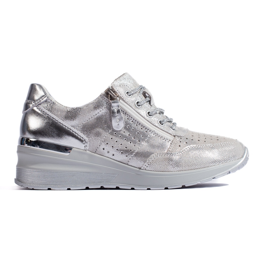 Descubra ténis de cunha em pele únicos numa cor prateada extremamente moderna, perfeitos para todas as mulheres modernas! Estes elegantes sapatos, produzidos pela marca Inna Marka, combinam elegância e carácter desportivo, o que os torna perfeitos para o estilo do dia a dia.