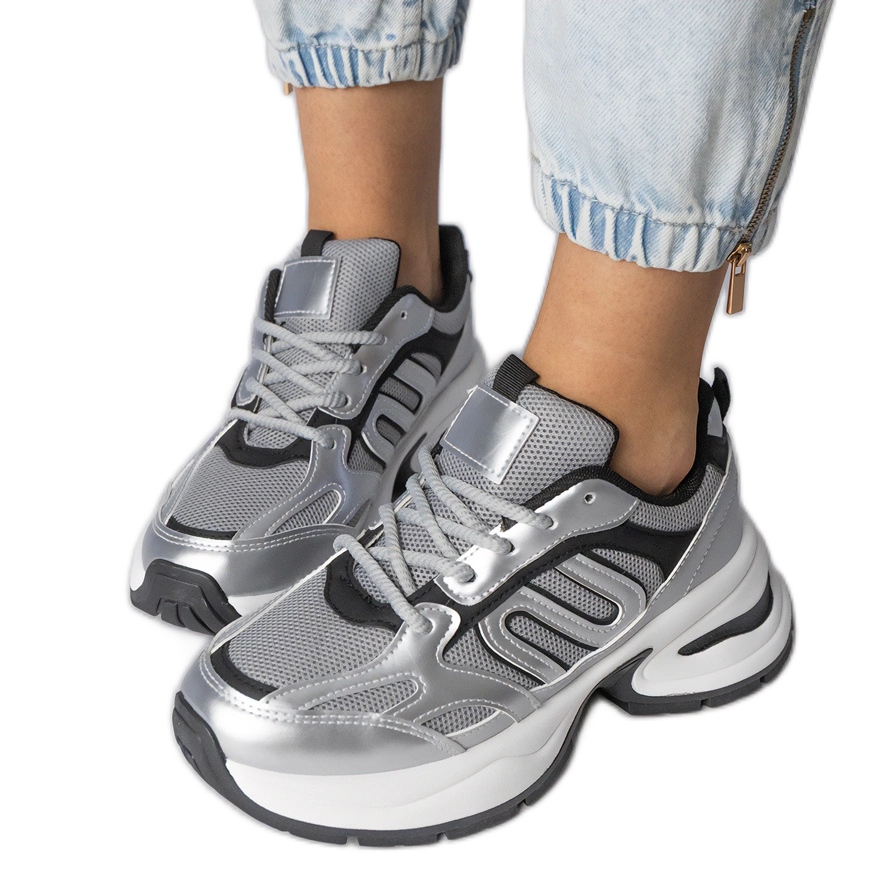 Os tênis de esportes de prata em uma sola enorme é uma proposta que certamente atrairá a atenção de todas as mulheres da moda. O modelo YY-9 L em uma cor de prata elegante combina estilo e conforto modernos, perfeitamente adequados às tendências atuais. A plataforma de 6 cm de alta garante excelente amortecimento, o que torna os sapatos perfeitos para estilizações diárias e atividades esportivas.