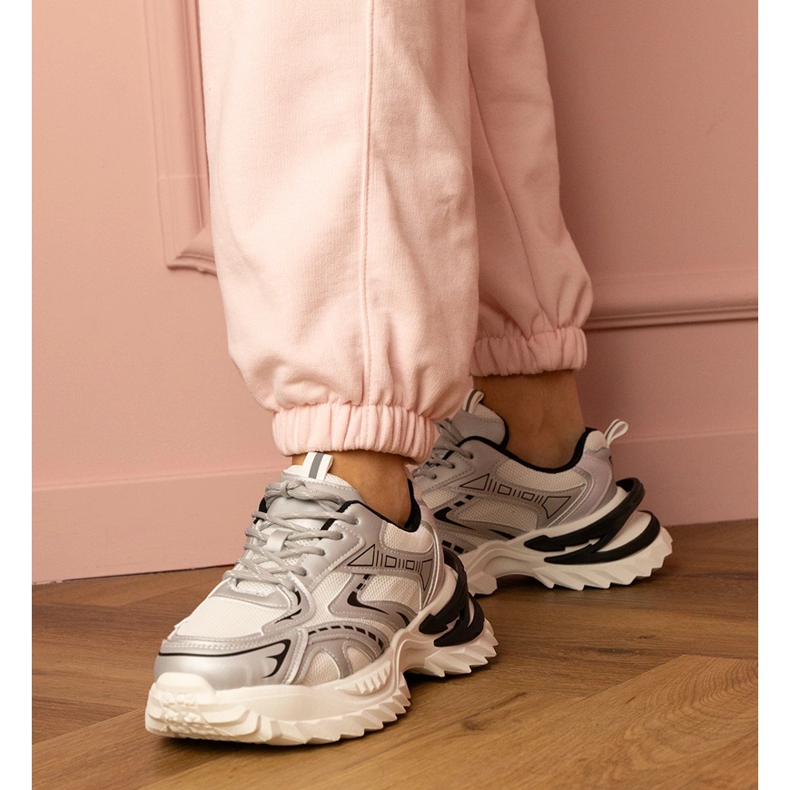 Detalhes: Tênis de esportes de prata em uma sola grossa