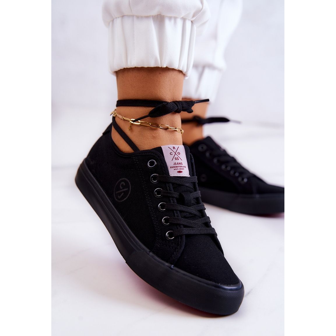 Jeans femininos JJ2R4049C tênis - Classic em uma edição casual. O modelo preto e material em uma plataforma delicada de 2 cm combina conforto com elegância moderada, ideal para estilizações cotidianas - de jeans a vestidos de verão.