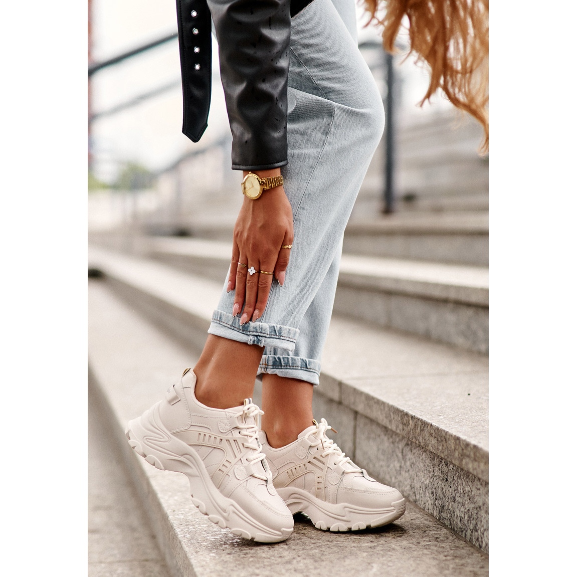 Esses tênis são universais - eles são perfeitos para estilizações casuais e mais elegantes. Eles se harmonizam bem com jeans, saias ou até macacões esportivos. A cor bege que domina neste modelo é extremamente funcional, combinando facilmente com outras cores.