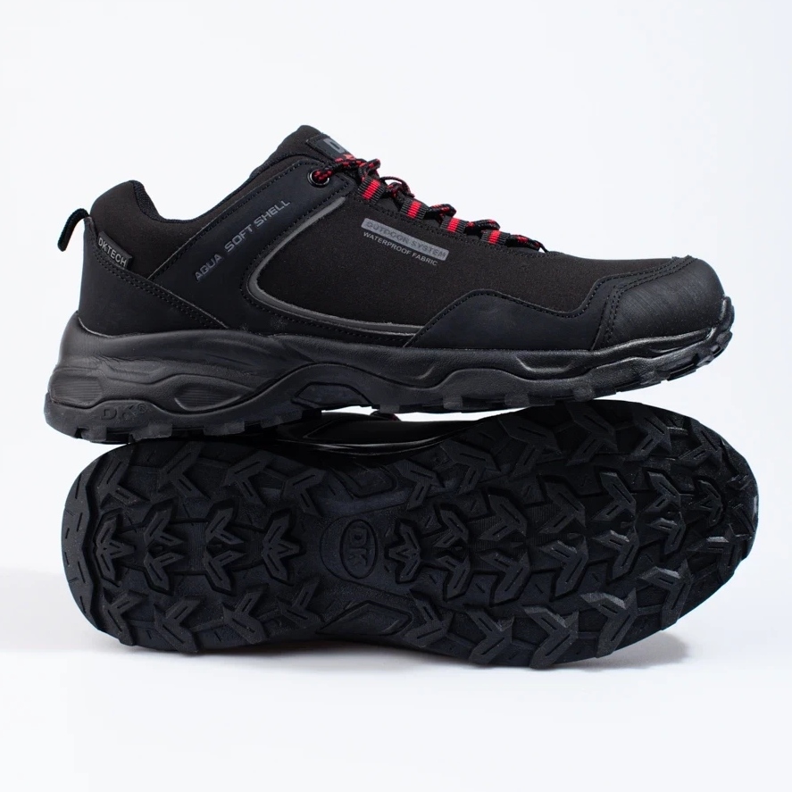Sapatos de trekking DK versáteis, leves e confortáveis em uma cor preta clássica - projetada para homens ativos que valorizam o conforto durante rotas mais longas e o uso diário. A parte superior foi criada a partir da combinação de couro ecológico e materiais têxteis (Softshell), que oferece boa resistência ao vento e garante alta respirabilidade. Graças aos materiais utilizados, os sapatos mostram maior resistência à umidade, mas não garantem 100% de impermeabilização - em condições de chuva intensa, podem se molhar.