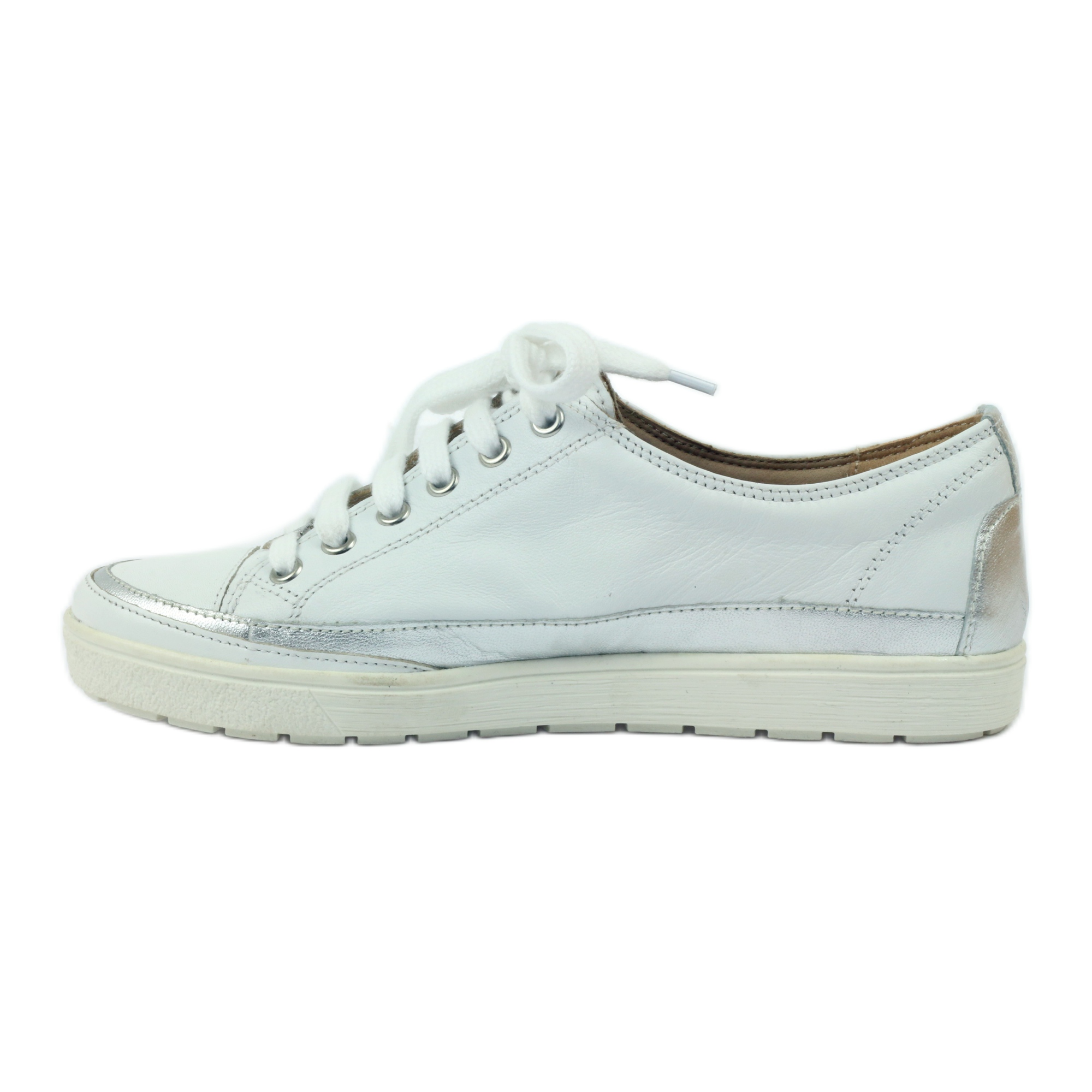 Detalhes: Tênis esportivo feminino Caprice 23654 couro branco e prata cinza