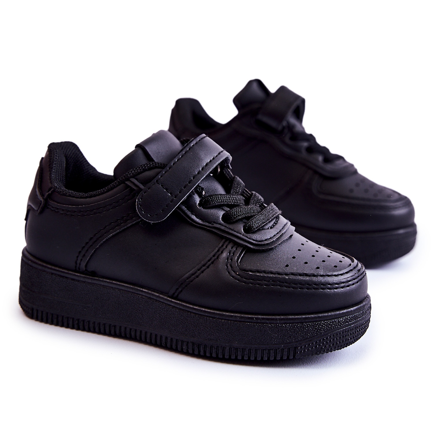 Sapatos esportivos para crianças para velcro. Um modelo clássico e preto feito de couro ecológico de alta qualidade com perfuração na frente, ideal para jardim de infância, brincadeiras ao ar livre e caminhadas diárias.