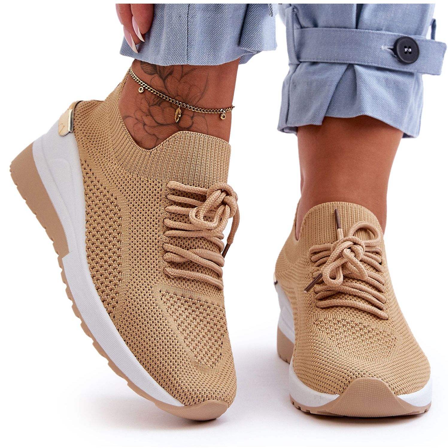 Os sapatos esportivos femininos e elegantes do PG1 combinam o conforto do corte de deslizamento com um Koturn da moda. A parte superior feita de tecido arejado em um tom de bege-khaki com sotaques dourados sutis significa que o modelo corresponde a estilizações cotidianas e elegantes. Os sapatos têm um nariz redondo, uma parte superior baixa (cerca de 6 cm) e uma cunha confortável de 6 cm de altura e uma plataforma de 1,5 cm, que opticamente diminui a figura, sem sobrecarregar os pés.