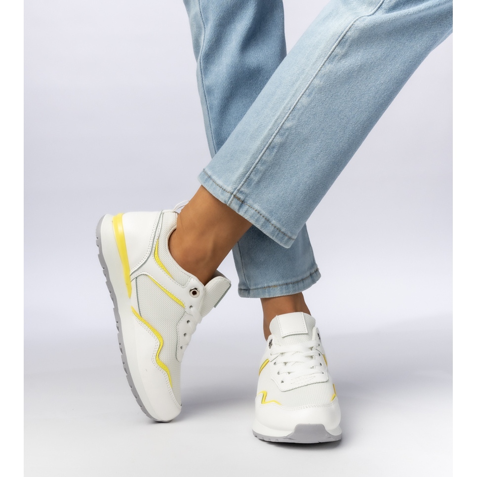 Grego com uma nova dimensão de conforto e estilo, graças aos tênis esportivos de nossas mulheres em branco. Esses sapatos leves e confortáveis são a escolha perfeita para mulheres que valorizam a aparência e a funcionalidade da moda. A parte superior branca, feita de tecido de alta qualidade e couro ecológico, cria uma dupla eficaz com detalhes sutis e amarelos que dão aos sapatos um caráter moderno e dinâmico.
