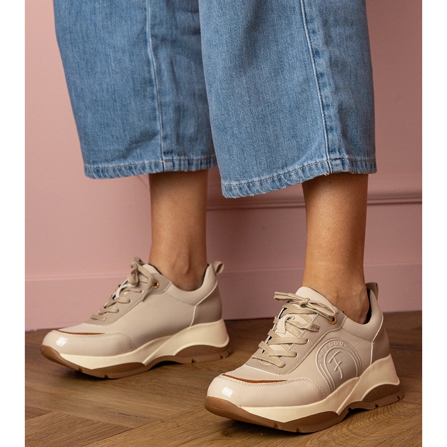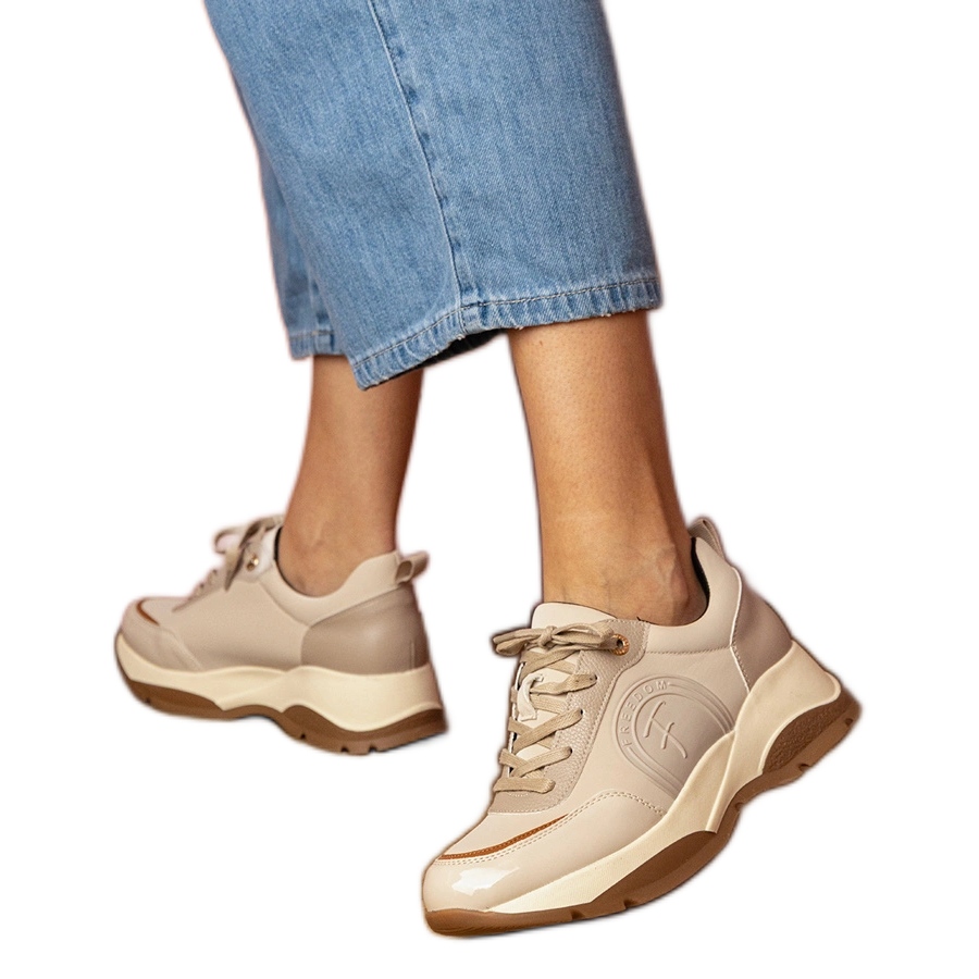 A cor bege dos sapatos em combinação com uma sola de borracha marrom torna os tênis universais e se adaptam facilmente a qualquer guarda -roupa. O acabamento envernizado lhes dá estilo, tornando -os a escolha perfeita diariamente para mulheres ativas que não desistem da aparência da moda.