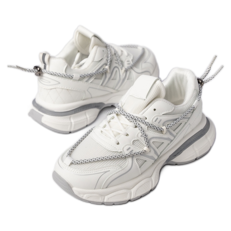 O interior dos sapatos acolchoados com tecido garante o conforto de usar, mesmo por longas horas, e o revestimento externo ecológico e de tecido faz com que os tênis não apenas estéticos, mas também fáceis de se cuidar. Um padrão suave e cores brancas moderadas com um delicado sotaque cinza fazem com que esses tênis se adaptem facilmente a vários estilos - tanto esportes quanto casuais.
