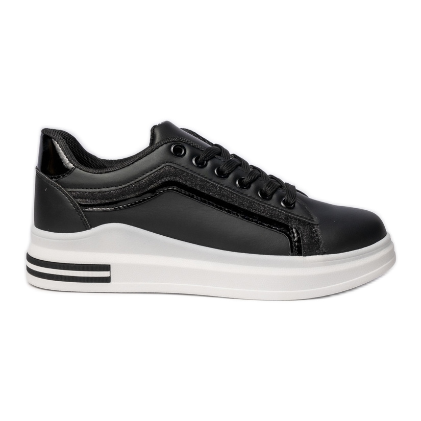 Apresentamos tênis esportivos femininos em uma elegante cor preta - uma combinação perfeita de estilo e conforto. Esses sapatos modernos são distinguidos por um design minimalista, que se encaixa perfeitamente nas tendências atuais da moda. O clássico preto, combinado com uma sola branca e grossa, lhes dá caráter e os torna um elemento perfeito das estilizações casuais e esportivas.