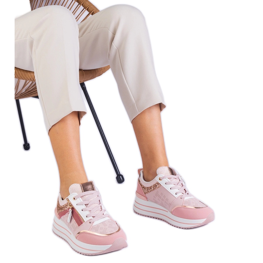 Apresentamos tênis esportivos rosa na plataforma decorada com glitter - a escolha perfeita para mulheres que desejam combinar uma aparência elegante com conforto. Esses tênis não são apenas calçados, mas uma manifestação real de estilo, perfeita tanto diariamente quanto para ocasiões menos formais.