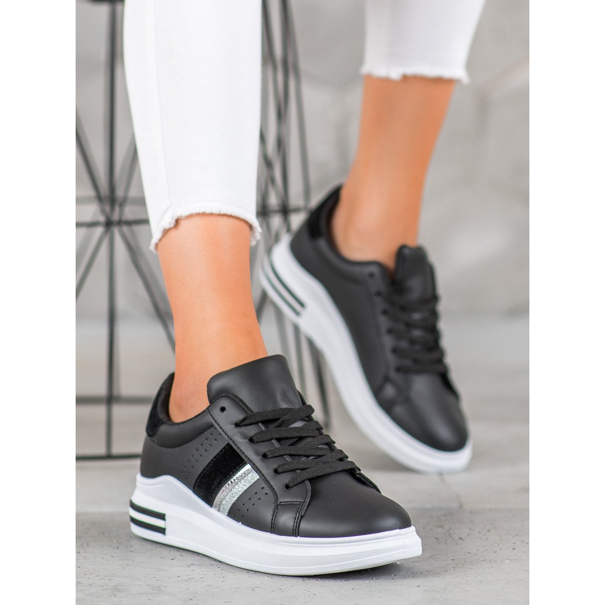 Estes ténis pretos não são apenas práticos, mas também extremamente elegantes, tornando-os fáceis de combinar com vários looks. Oferecem um caráter casual e esportivo que pode ser enfatizado tanto com jeans quanto com vestidos. Escolha SHELOVET e desfrute de uma adição moderna ao seu guarda-roupa!