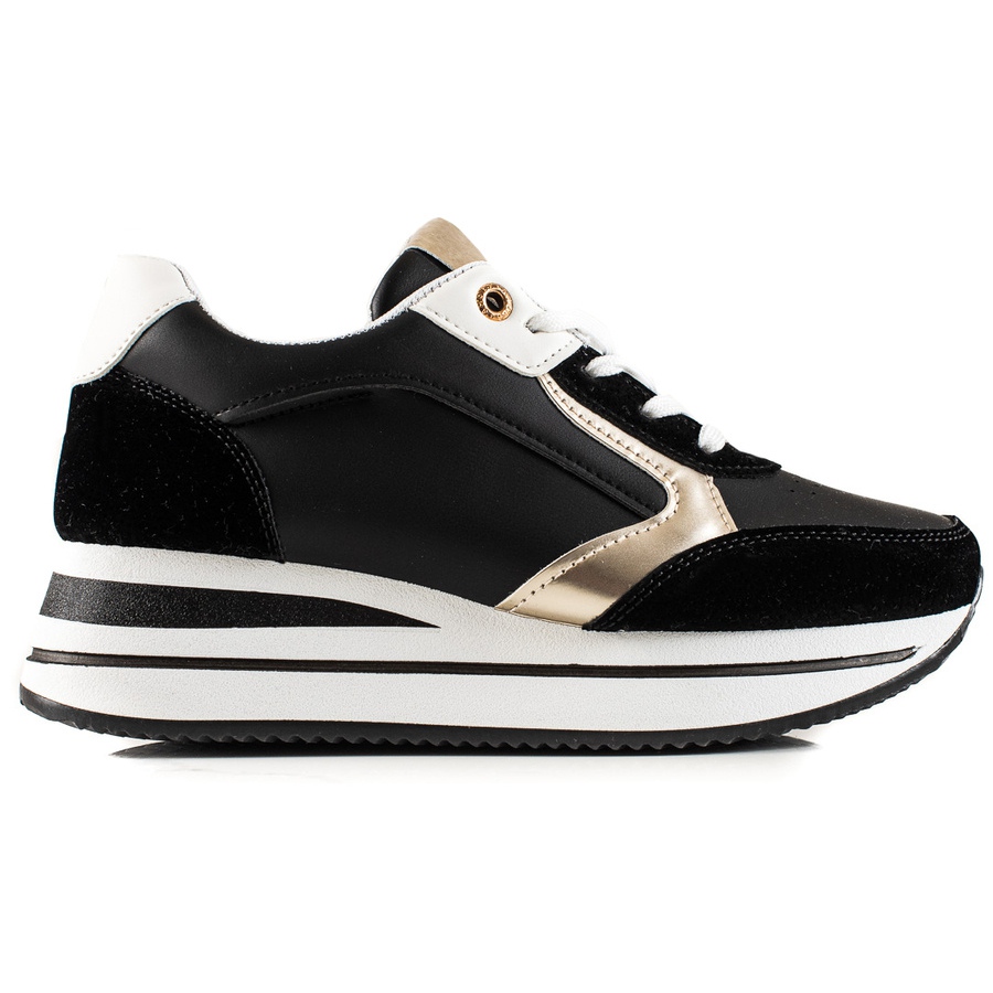 Os elegantes tênis pretos da TRENDI são a escolha perfeita para toda mulher moderna que valoriza conforto e um visual moderno. Estes calçados esportivos femininos são caracterizados por um salto baixo embutido que garante conforto no uso diário. Equipados com sola de borracha com banda de rodagem, oferecem grande aderência, o que os torna adequados tanto para passeios do dia a dia como para passeios pela cidade.