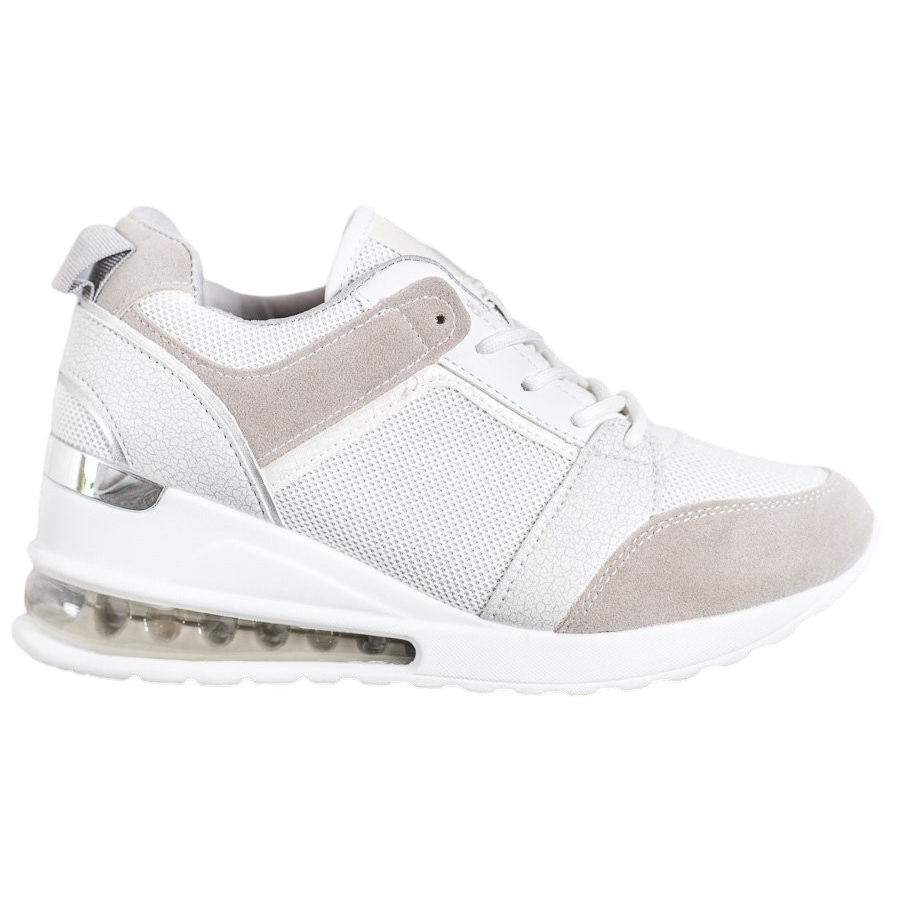 A parte superior do tênis é feita de uma combinação de material branco e inserções cinza de plástico imitando couro, o que lhes confere um visual elegante. Cadarços brilhantes nas costas acrescentam leveza e enfatizam seu caráter esportivo. A plataforma branca de 6 cm de altura com inserto transparente não só alonga opticamente as pernas, mas também garante conforto no uso. Uma sola de borracha com banda de rodagem adequada garante estabilidade e excelente aderência em diversas superfícies.