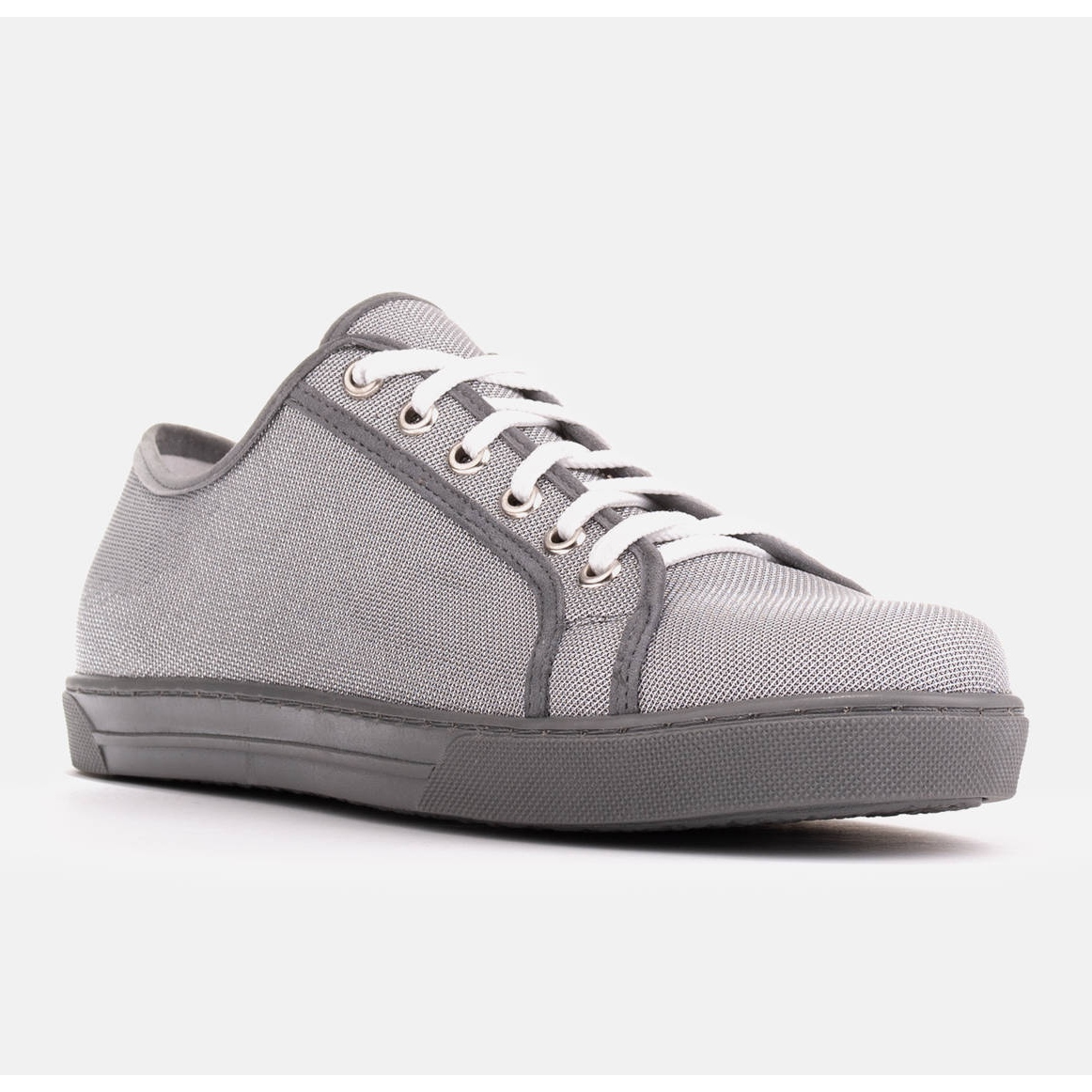 O modelo descrito chama-se "Tênis com cadarço prateado" e se diferencia pela cor cinza prateado, que também se reflete no nome da cor do fabricante - Prata/Cinza. O look é complementado por uma sola cinza. O cabedal é confeccionado em tecido que, além do visual atraente, é respirável, aumentando o conforto de uso.