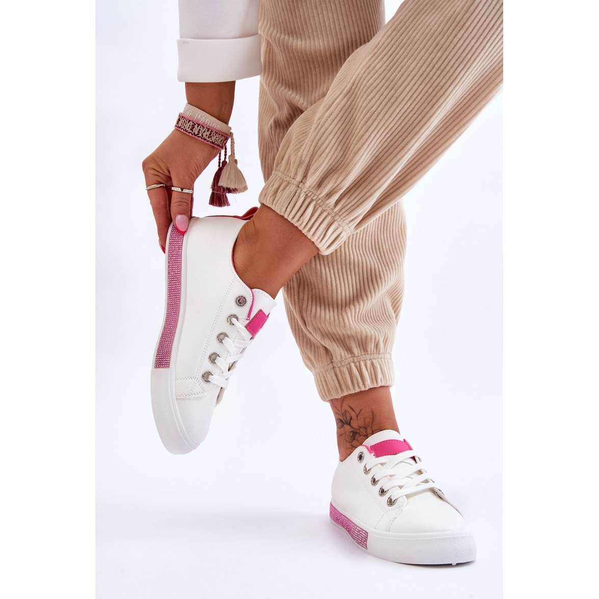 Descubra estilo e conforto únicos com tênis feminino baixo com strass na linda cor branco e rosa da Demira. Este modelo atemporal deve estar no guarda-roupa de toda mulher, oferecendo inúmeras possibilidades de estilo. Eles combinam perfeitamente com jeans casuais e vestidos arejados, adicionando personalidade a qualquer look.