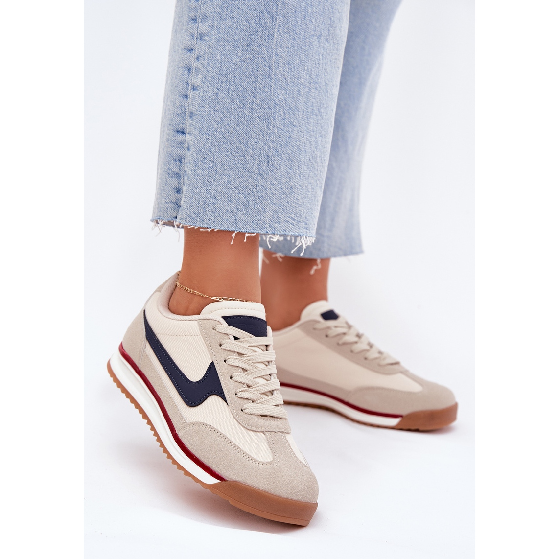 Os tênis têm uma plataforma de 2 cm de altura, o que adiciona um sotaque elegante a eles, e o nariz redondo garante a liberdade de pontas dos dedos. Uma cor bege delicada com uma sola marrom se encaixa perfeitamente nas tendências atuais e combina facilmente com várias roupas.