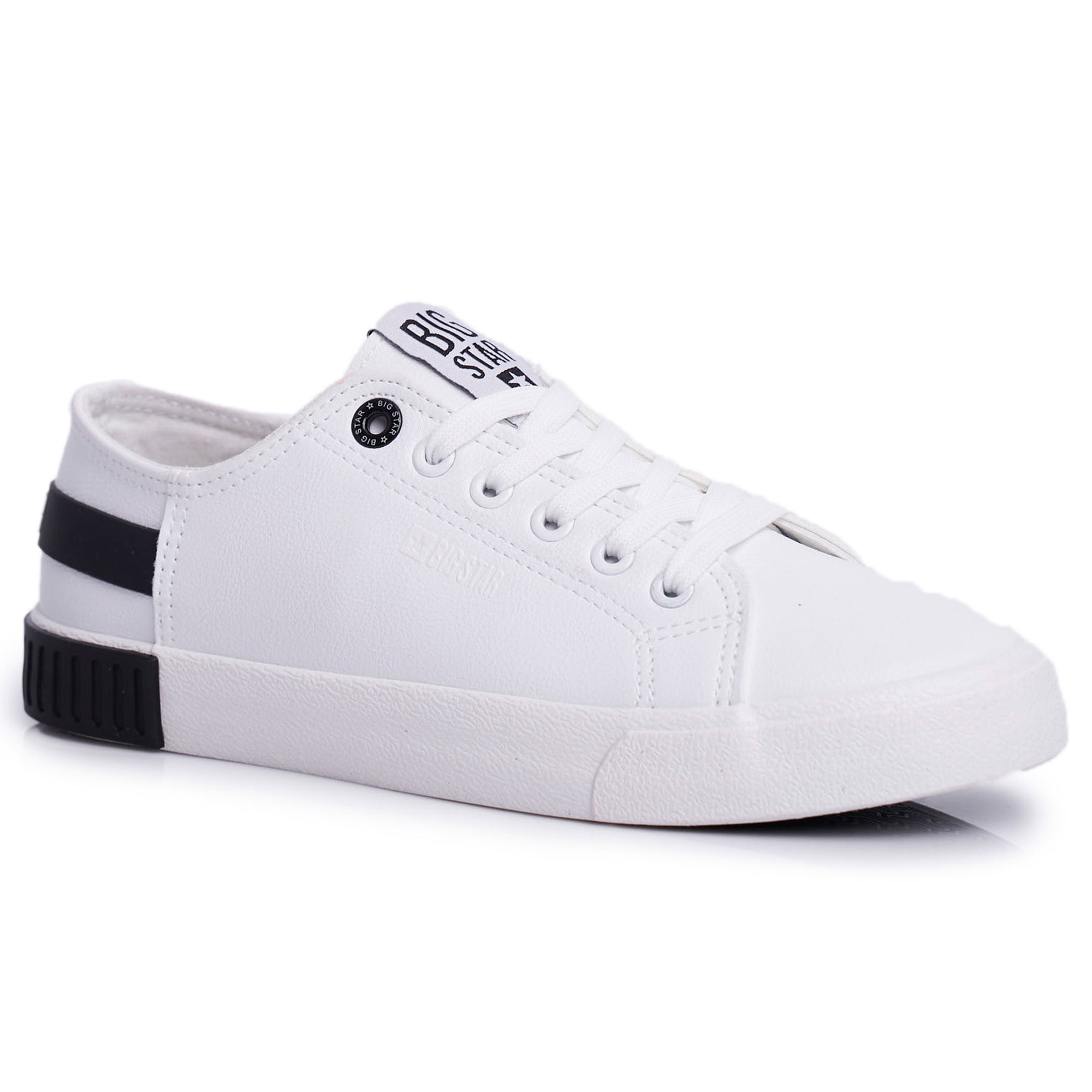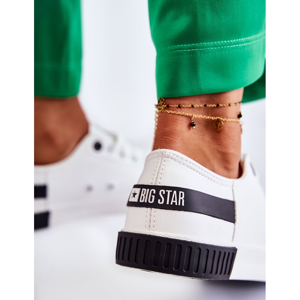 Esses charmosos tênis brancos são confeccionados em couro ecológico de alta qualidade. Ao cuidar de cada detalhe, os designers da Big Star garantem que o couro ecológico não só tenha uma ótima aparência, mas também seja durável e fácil de manter. Na parte de trás do sapato há um elegante salto preto com uma sutil inscrição Big Star, que adiciona um caráter esportivo ao conjunto.