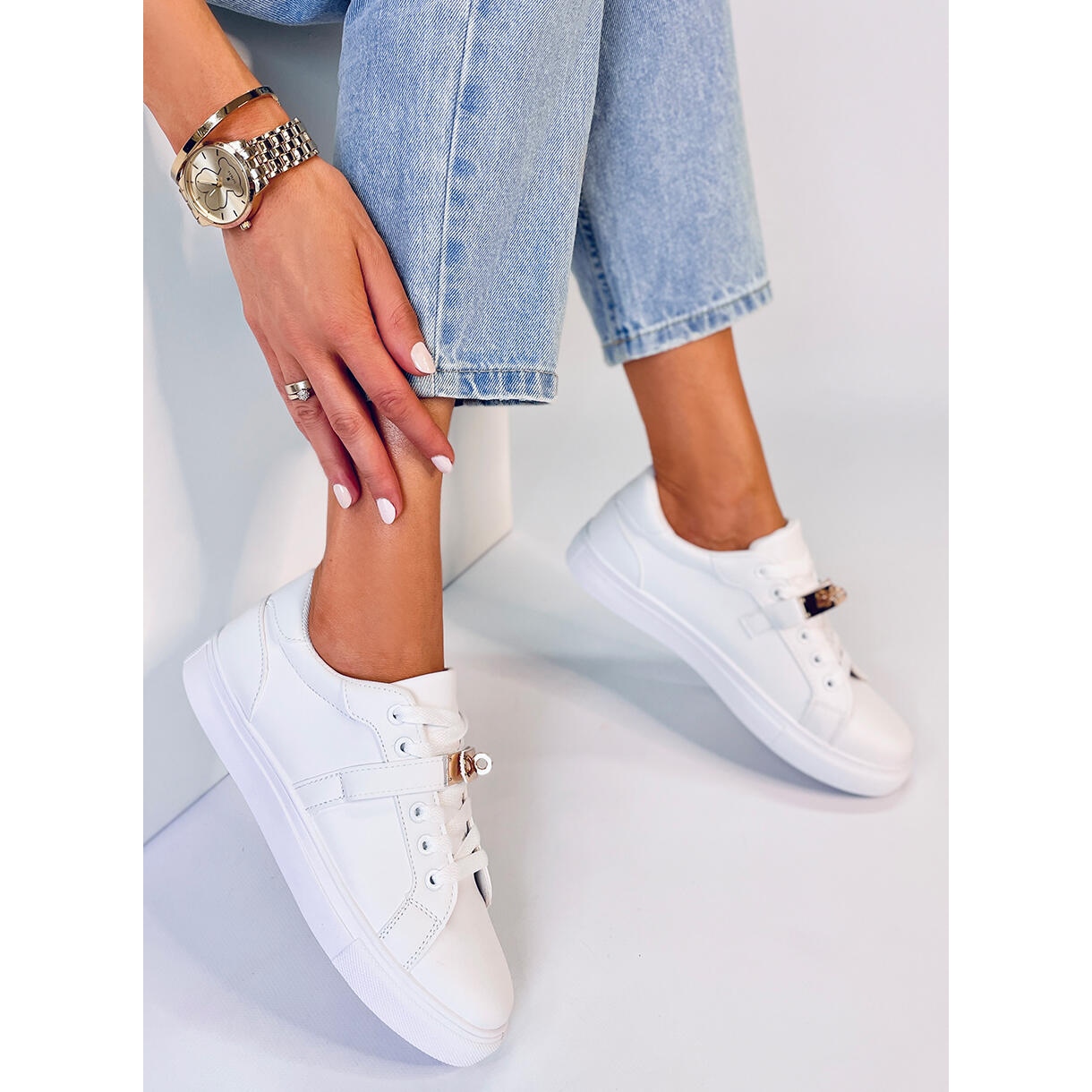 O tênis branco é um item do guarda-roupa que combina com praticamente tudo – de jeans a vestidos, criando inúmeras combinações para cada ocasião. O nosso modelo distingue-se por um elegante fecho dourado, que lhe confere um carácter único e um pouco de brilho.