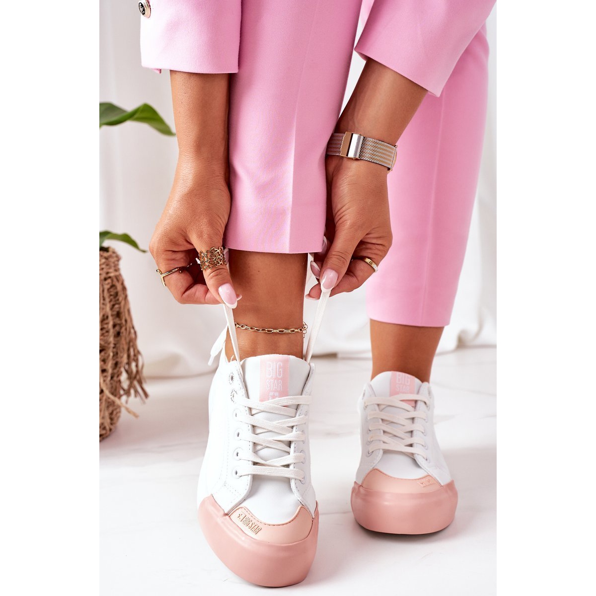 Apresentamos o Tênis Feminino de Couro Big Star II274027 nas charmosas cores branco e rosa. Estes elegantes tênis da marca polonesa BIG STAR são a escolha perfeita para mulheres que valorizam a combinação de conforto e aparência moderna. O formato clássico do tênis cabe perfeitamente em vários estilos, tanto para o uso diário quanto para ocasiões mais casuais.