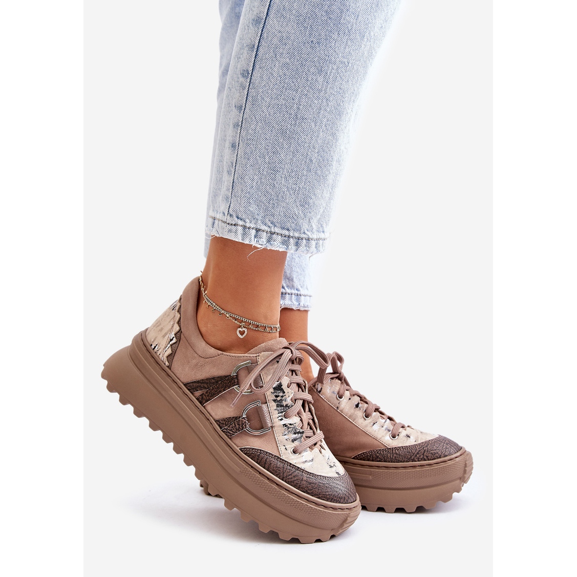 As vantagens deste modelo não são apenas estéticas, mas também o conforto de usar. A plataforma de 5 cm de altura estende sutilmente as pernas, garantindo estabilidade e conforto ao caminhar. A parte superior padronizada é um elemento único que distingue esses sapatos do fundo de outros. Um nariz redondo e um fecho amarrado fazem o calçado se adaptar perfeitamente ao pé, e a inserção do tecido cuida de conforto ao longo do dia.