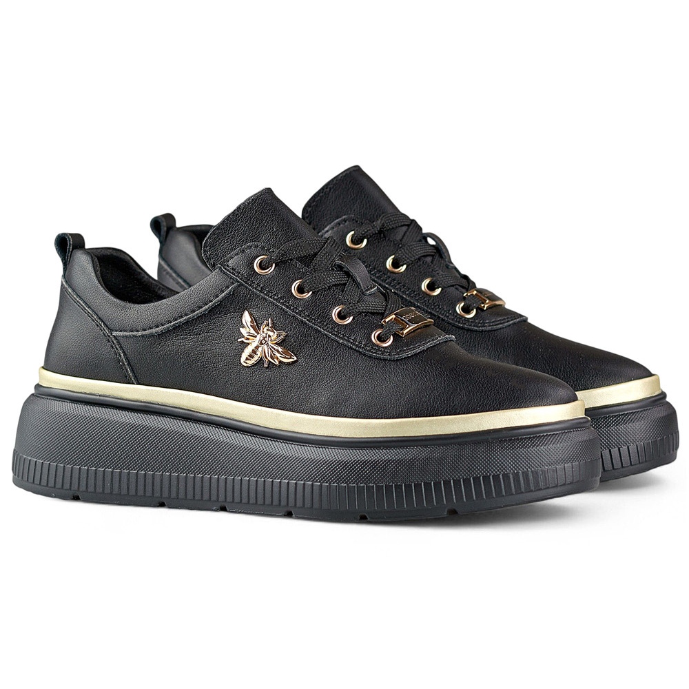 Detalhes: Tênis feminino de couro preto com acessórios dourados