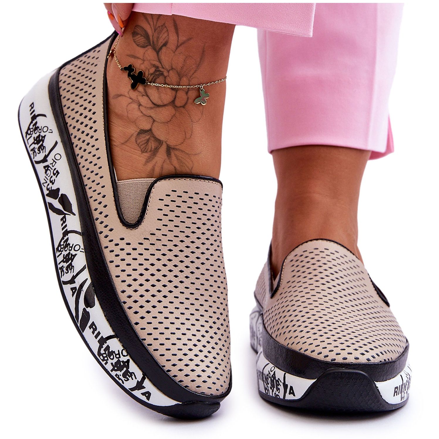 Detalhes: S.Barski Tênis feminino de couro vazado sem cadarço bege Sorito