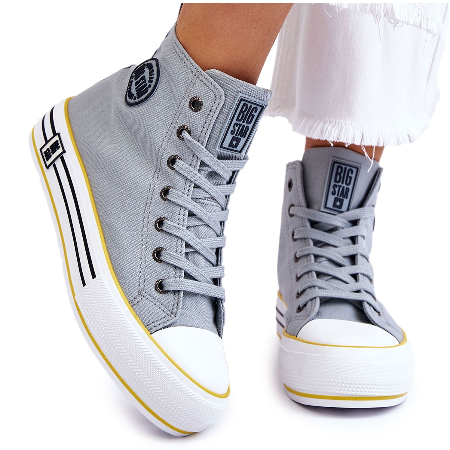 Tênis altos feitos de material têxtil durável, montados em uma enorme plataforma de borracha (3,5 cm de altura) com uma sola não -deslizante. O laço clássico permite um bom ajuste, e o salto rígido garante a estabilização do pé. Um logotipo de borracha sutil da marca Big Star na lateral da parte superior. O modelo do tornozelo é ideal para a luz da temporada da primavera, arejada e ao mesmo tempo, bem segurando a perna.