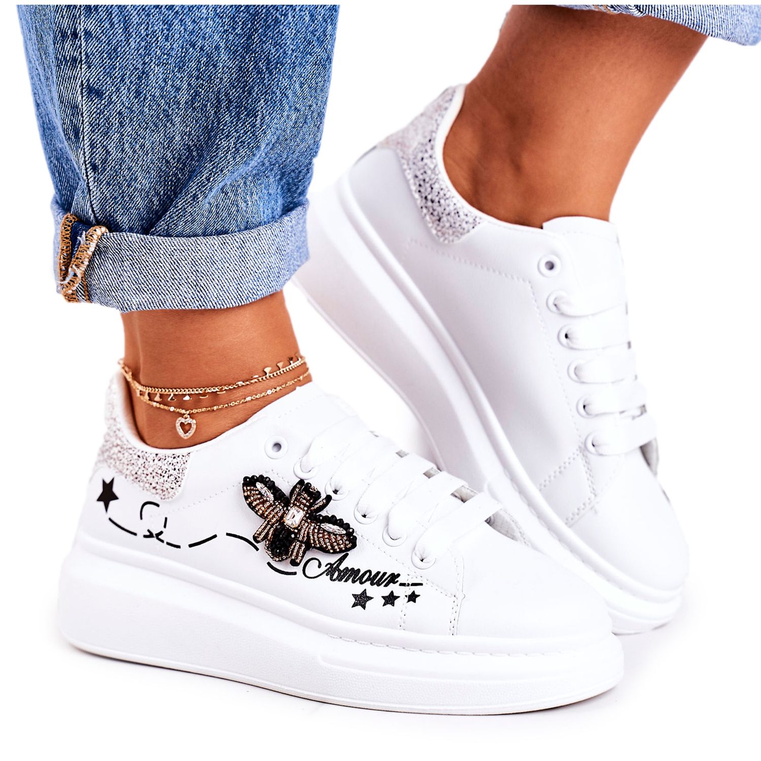 Apresentamos Tênis Esportivos Femininos com Laço Decorativo em branco e prata, perfeitos para os amantes de calçado moderno e confortável. Estes estilosos tênis se diferenciam pelo couro ecológico e strass que lhes conferem um caráter único.