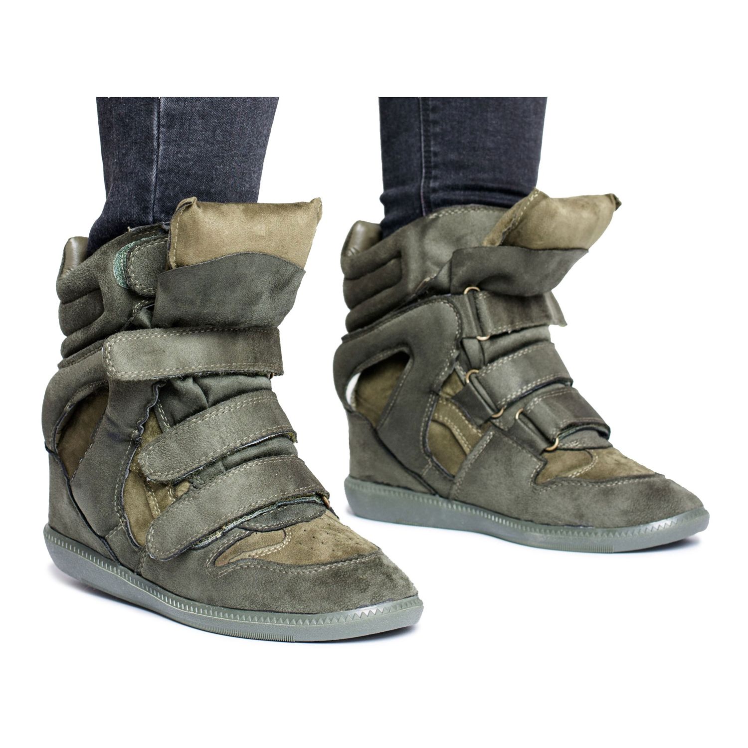 Oferecidos em um atraente tom oliva, feitos de camurça ecológica de alta qualidade, eles têm um visual extremamente estiloso e elegante. Graças ao material agradável ao toque, você se sentirá confortável o dia todo. Os tênis foram projetados para caber facilmente no pé, o que é garantido por 4 tiras sólidas de velcro. Graças a eles, calçar e tirar os sapatos torna-se rápido e descomplicado.
