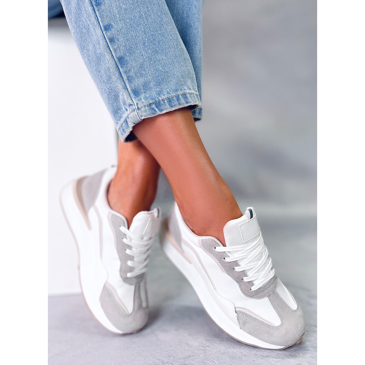 Apresentamos os ténis Mabel para mulher numa elegante combinação de cores Branco/Bege/Cinzento! Estes calçados esportivos exclusivos com sola alta são a escolha perfeita para todas as mulheres que valorizam estilo e conforto. Fabricados com materiais duráveis - combinação de tecido, couro ecológico e camurça - garantem não só um visual atraente, mas também conforto em cada passo.