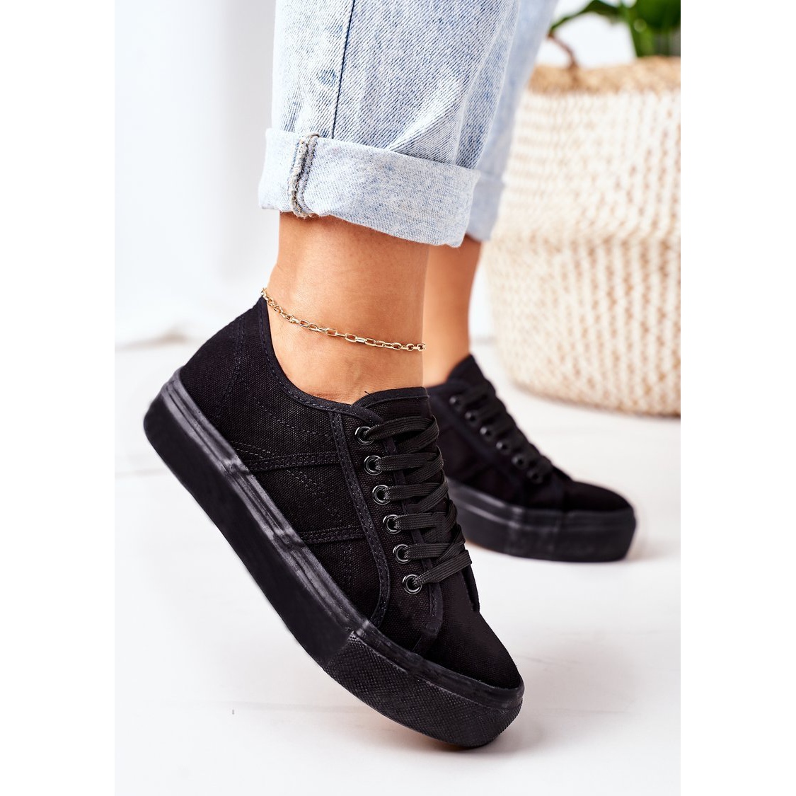 Os elegantes tênis plataforma femininos PW1 em preto são a escolha perfeita para mulheres que valorizam a aparência moderna e o conforto. Estes ténis modernos distinguem-se por uma grande plataforma de borracha com 3 cm de altura, que não só acrescenta alguns centímetros de altura, mas também proporciona estabilidade ao caminhar.