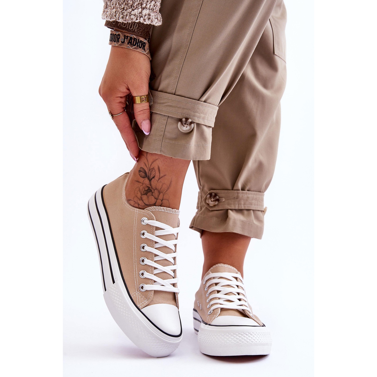 A altura superior de 5,5 cm confere personalidade e a biqueira redonda torna o tênis elegante e agradável à vista. A sua cor bege universal combina bem com uma variedade de calças e saias, o que os torna uma excelente base para o estilo do dia a dia.