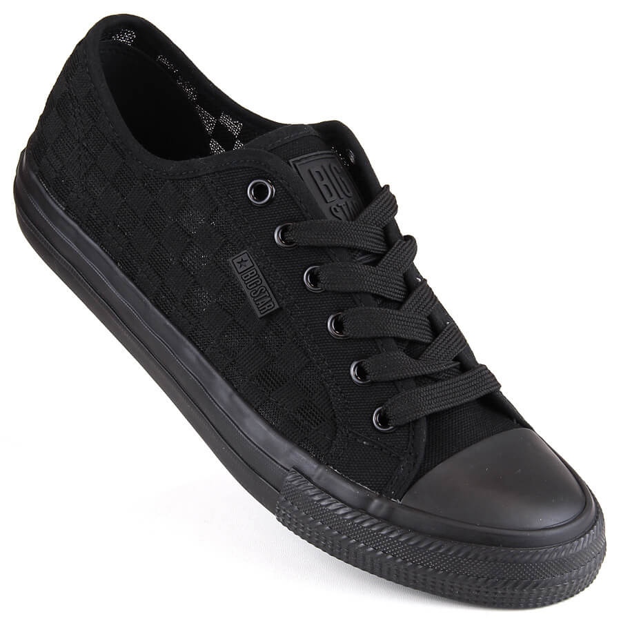 Os tênis negros da Big Star são distinguidos por uma estrutura de trabalho aberto que fornece ventilação adequada, tornando -os uma escolha perfeita na primavera e no verão. O nariz redondo e baixo e o fecho atado lhes dão leveza e uma aparência clássica. A sola de borracha garante uma boa aderência e conforto do desgaste, o que os torna ótimos para passear e para saídas mais ativas, por exemplo, para a academia.