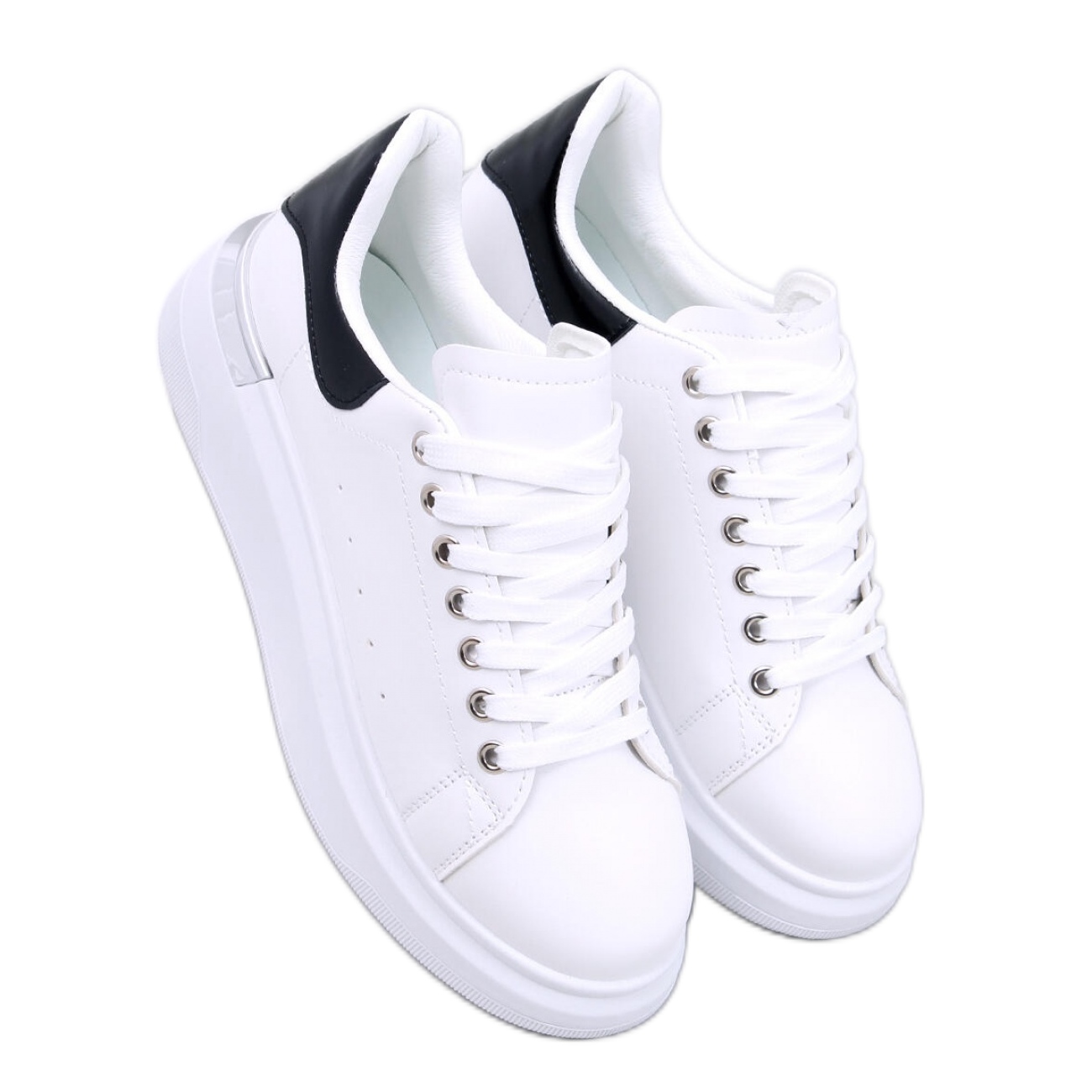 Graças à sola alta com uma altura de 5 cm, os tênis não apenas adicionam centímetros, mas também fornecem conforto a cada passo. Um nariz redondo e um design minimalista em uma combinação clássica de brancos com detalhes pretos tornam esses sapatos combinam perfeitamente com estilos diferentes, de casual a mais elegante.