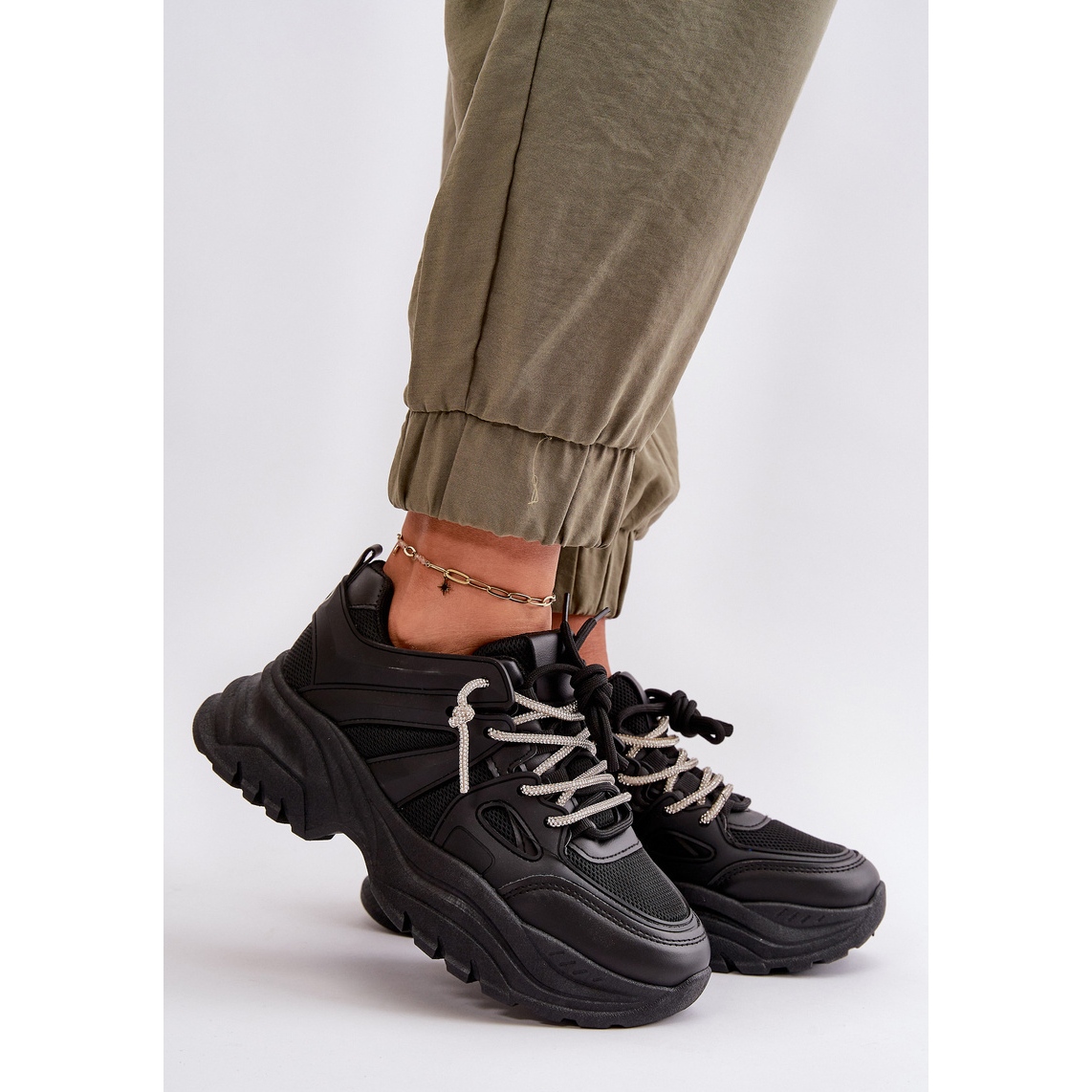 Os tênis femininos em uma sola enorme com Lacing Black Relsa decorativo é uma proposta ideal para mulheres que desejam combinar moda com conforto. Esses sapatos elegantes se diferenciam por uma enorme sola de 4 cm de altura, que oferece excelente amortecimento e estabilidade ao caminhar.