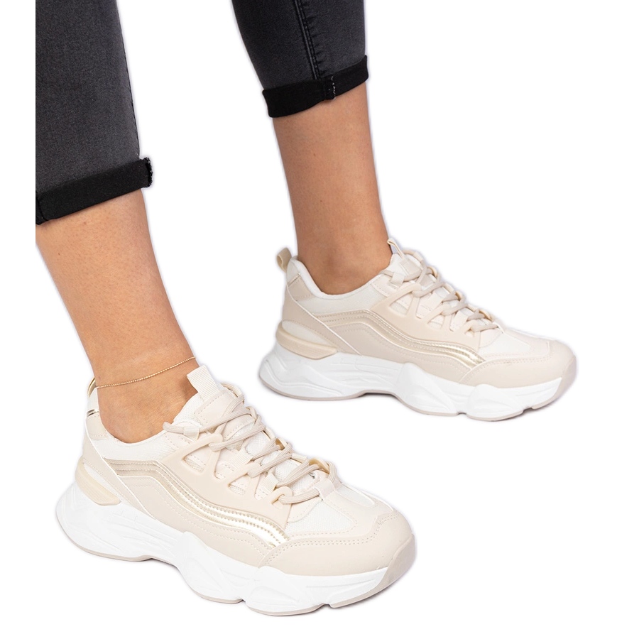 Detalhes: Tênis femininos bege com uma adição de ouro