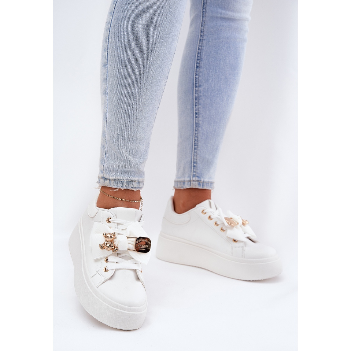 Detalhes: Tênis femininos com um arco e um broche com um ursinho de pelúcia branca branco