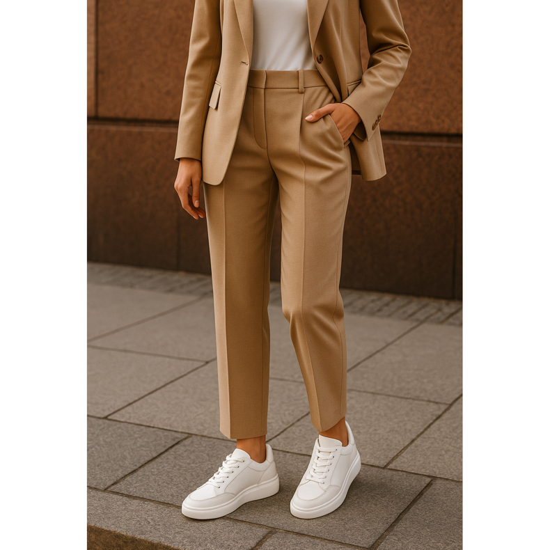A tendência de conectar um terno com tênis conquista o mundo da moda comercial. É uma solução ideal para mulheres que querem parecer profissionais, enquanto se sentem confortáveis ao longo do dia. Escolha modelos minimalistas em cores neutras - branco, preto ou bege. Os tênis de couro adicionarão elegância enquanto Suede introduz suavidade. Lembre -se das proporções - escolha sapatos mais maciços para calças mais largas, modelos mais esbeltos para mais estreito. Esse visual funciona muito bem em reuniões de negócios, onde a criatividade conta.