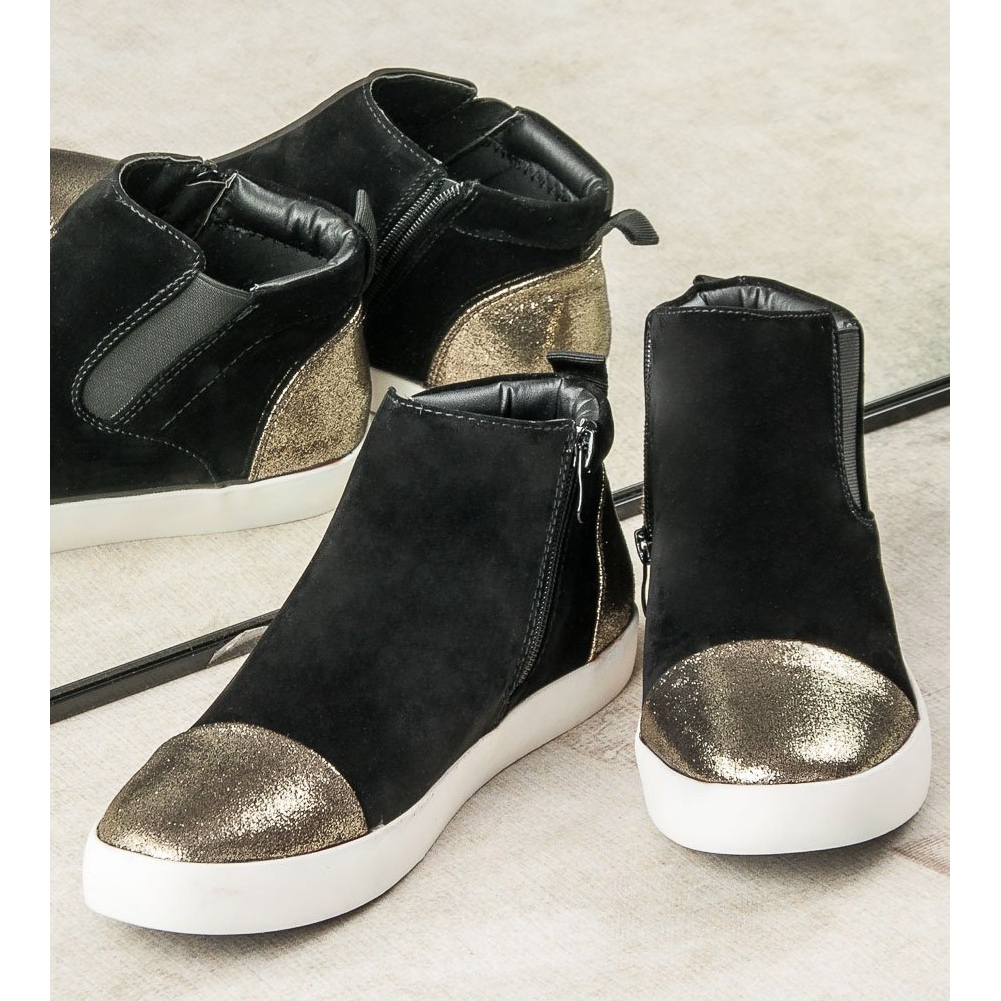 Apresentamos elegantes tênis J. Star femininos que combinam perfeitamente estilo com conforto. Estes sapatos pretos de camurça ecológica têm um visual único graças aos acabamentos dourados brilhantes na biqueira arredondada e no salto. Os tênis fecham com um prático zíper, e a parte superior chega abaixo dos tornozelos, o que os faz ajustar-se perfeitamente ao pé.