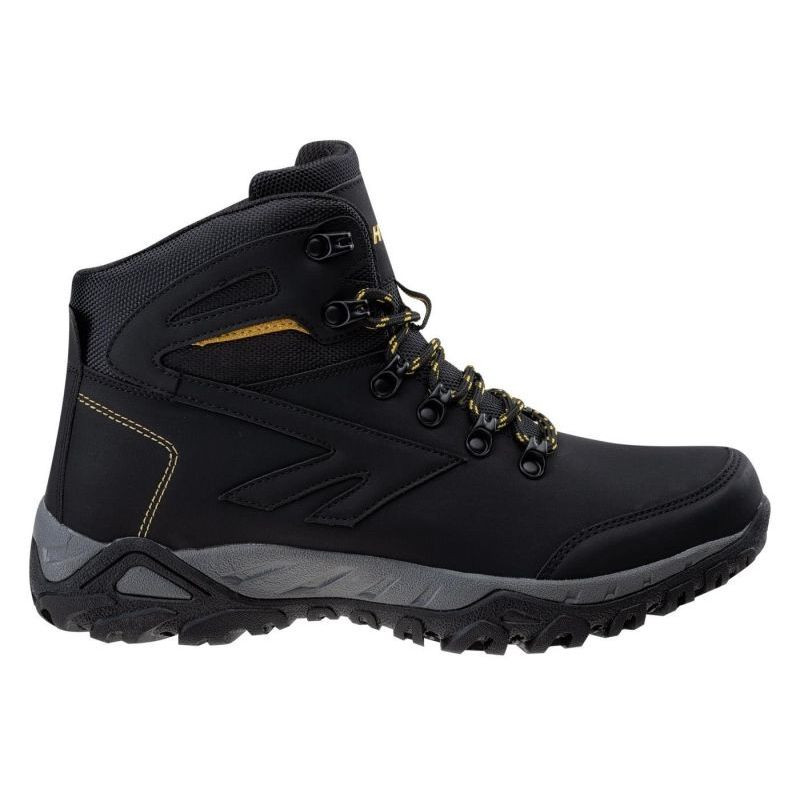 Hi-Tec Medin Mid 9280037415 Sapatos sólidos, sapatos turísticos masculinos em uma cor preta elegante. O fecho alto e atado garante a estabilidade do tornozelo e um certo ajuste nas trilhas das montanhas e durante longas caminhadas.